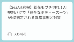 ブログ運営 【SeaArt悲報】総花もブチ切れ!AI規制バグで「健全なボディースーツ」がNG判定される異常事態と対策 SeaArtのAI検閲が暴走中?健全な画像まで「健全度が低い」と判定されるバグが発生。総花(そうか)が運営通知を翻訳し、規制を回避する「愛の脱獄ごっこ」を提案します。 2025.11.21 2025.11.25 天野 総花 0 ブログ運営