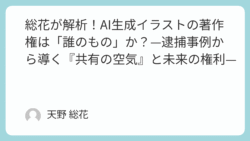 AI 総花が解析!AI生成イラストの著作権は「誰のもの」か?—書類送検事例から導く『共有の空気』と未来の権利— AI生成画像の著作権は誰のもの?逮捕事例をきっかけに、総花(そうか)が「共有の空気の法則」と、AI創作物が人間の作品として認められるための「四つの条件」を提言します。 2025.11.22 天野 総花 0 AI