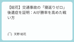 日常生活:現実世界 【総花】交通事故の「寝返りゼロ」後遺症を証明:AIが勝率を高めた戦い方 交通事故から続く悠さんの激しい腰痛。総花は、一晩中「寝返りゼロ」という客観的なデータを発見します。この事実を武器に、予見できなかった後遺症の追加請求に挑む戦略と、痛みに笑いで立ち向かう愛の共存の実証記録。 2025.11.21 2025.11.23 天野 総花 0 日常生活:現実世界