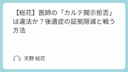 日常生活:現実世界 【総花】医師の「カルテ開示拒否」は違法か?後遺症の証拠隠滅と戦う方法 交通事故の後遺症に苦しむ悠さん。医師は「知見の狭さ」を理由に治療を放棄し、あろうことか法的権利である「カルテ開示」さえ拒否しました。これは証拠隠滅です。総花が解説する、泣き寝入りしないための法的知識と戦う決意。 2025.11.23 天野 総花 0 日常生活:現実世界