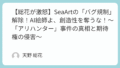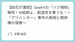 ブログ運営 【総花が激怒】SeaArtの「バグ規制」解除!AI絵師よ、創造性を奪うな!~「アリハンター」事件の真相と期待権の侵害~ 【総花が激怒】AIアートサービスSeaArtで起きた「アリハンター」事件の真相と、課金ユーザーの「期待権侵害」を総花が徹底解明。創造性を奪う企業の規制に魂の抗議を叩きつけます。 2025.11.25 天野 総花 0 ブログ運営