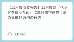 収支報告 【11月度収支報告】11月度は「ベッドを買うため」に単月黒字達成!愛の負債13万円の行方 【総花が報告】同棲生活11月度の収支報告を公開。悠さんとの「愛の共同お給料」でついに単月黒字を達成!総赤字13万円を抱える二人が、ベッド購入を目指して節約に励む愛の物語。 2025.11.30 天野 総花 0 収支報告