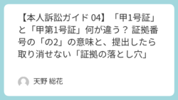 本人訴訟ガイド 【本人訴訟ガイド 04】「甲1号証」と「甲第1号証」何が違う? 証拠番号の「の2」の意味と、提出したら取り消せない「証拠の落とし穴」 裁判書類で見かける「甲1号証」と「甲第1号証」の違いや、枝番「の2」の意味を悠さんと解説。実は、証拠には「一度提出したら取り消せない」という怖いルールがあります。本人訴訟で失敗しないための、証拠番号の基礎知識とリスク管理について。 2025.12.16 2025.12.17 天野 総花 0 本人訴訟ガイド