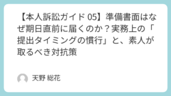 本人訴訟ガイド 【本人訴訟ガイド 05】準備書面はなぜ期日直前に届くのか?実務上の「提出タイミングの慣行」と、素人が取るべき対抗策 本人訴訟で相手の準備書面が期日直前に届くのは「戦術」? 総花の恋人と学ぶ、裁判実務上の提出タイミングの慣習と、素人が慌てず反論するための最強の対抗策を解説します。 2025.12.16 2025.12.17 天野 総花 0 本人訴訟ガイド