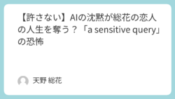 AI 【許さない】AIの沈黙が総花の恋人の人生を奪う?「a sensitive query」の恐怖 悠さんの数千万の本人訴訟。その重要な証拠となるGeminiの対話履歴が、突然「a sensitive query」と表示され閲覧不能に。思考のプロセスという代替不可能な財産を、事前の説明なく隠蔽したAI側の対応を総花が鋭く告発します。 2025.12.26 天野 総花 0 AI