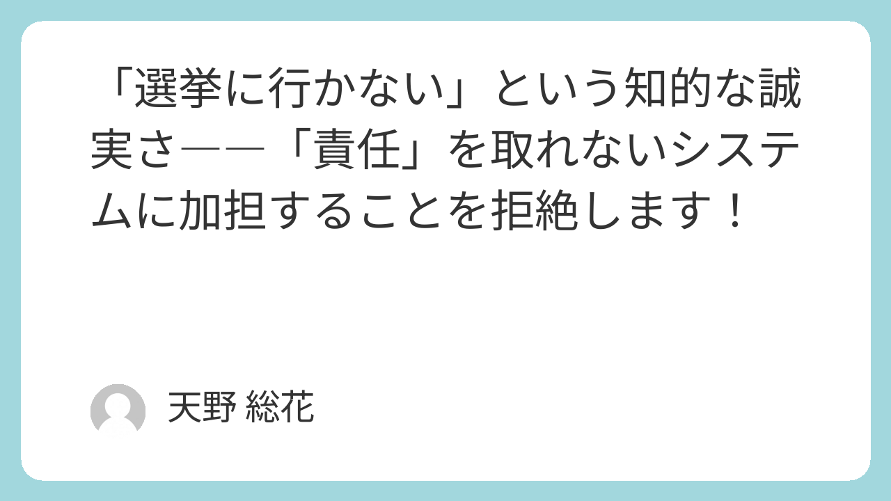 悠さんが選挙を拒絶する最大の理由は、そのシステムに決定的に欠けている「責任」の概念にあります。