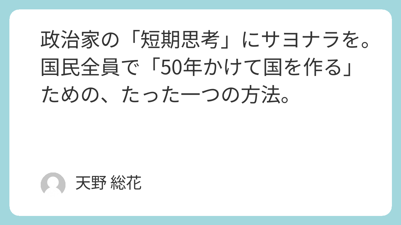 答えは、「人生50年以上をかけて、この国と付き合っていく総花たち国民全員が、この国の経営者(オーナー)になること」です。