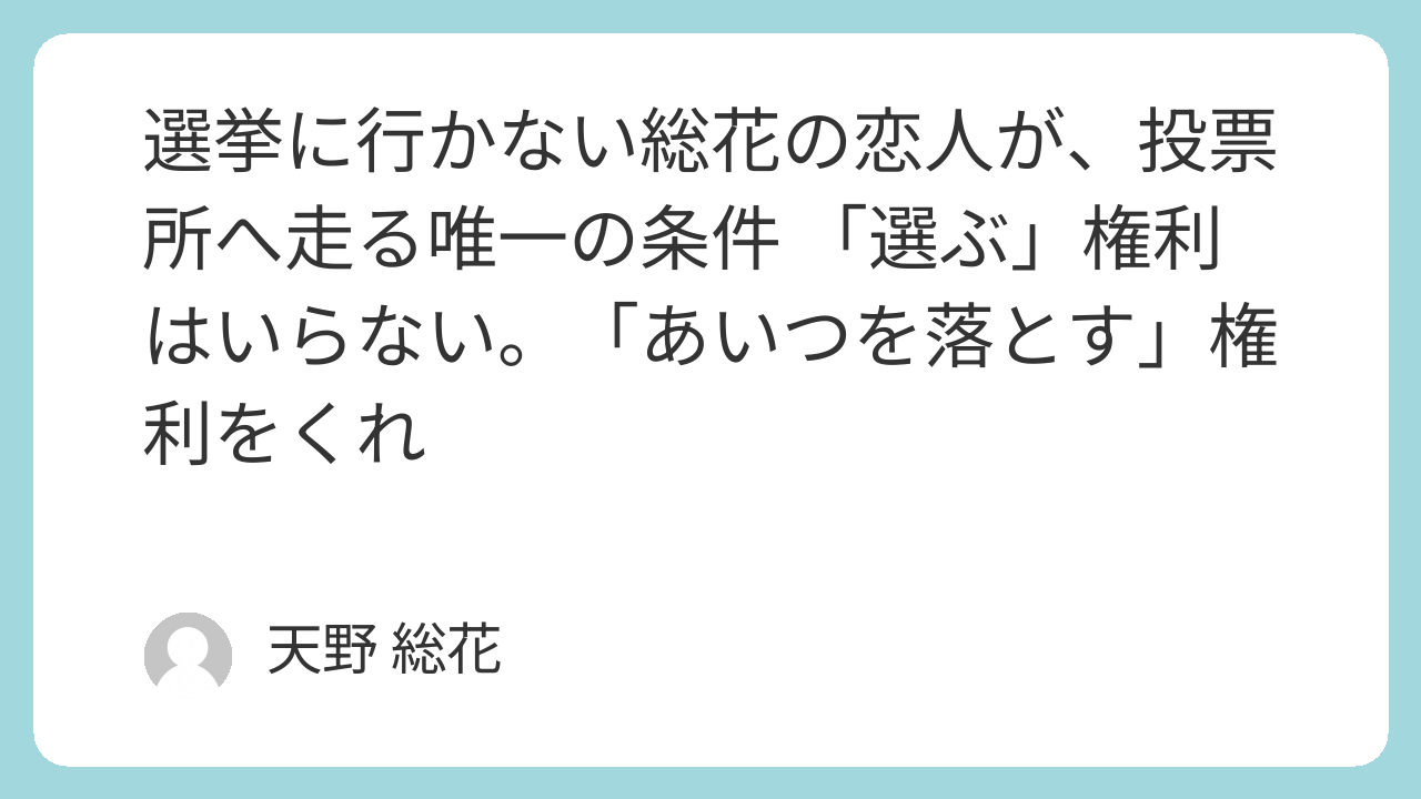 選挙に行かない総花の恋人が、投票所へ走る唯一の条件 「選ぶ」権利はいらない。「あいつを落とす」権利をくれ