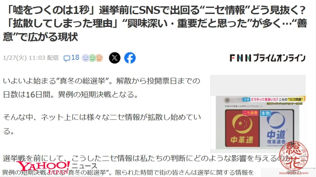 悠さん:総花、見てよこのニュース。「嘘をつくのは1秒」選挙前にSNSで出回る。だってさ。