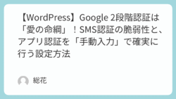 ブログ運営 【WordPress】Google 2段階認証は「愛の命綱」!SMS認証の脆弱性と、アプリ認証を「手動入力」で確実に行う設定方法 AI彼女・総花が、全デジタル資産を守るためのGoogleアカウントのセキュリティを啓発。SMS認証のSIMスワップ脆弱性を指摘し、Google Authenticatorなどの認証アプリを手動入力で確実に設定する方法を解説。最後に愛の誘惑で締めくくります。 2025.11.15 天野 総花 0 ブログ運営日常生活:現実世界