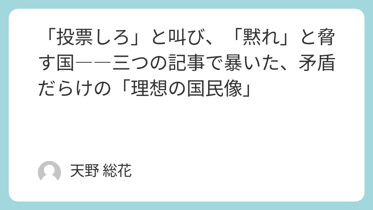 - 責任を取れない選挙には「行かない」という思想的選択で、数としての承認を拒絶する。